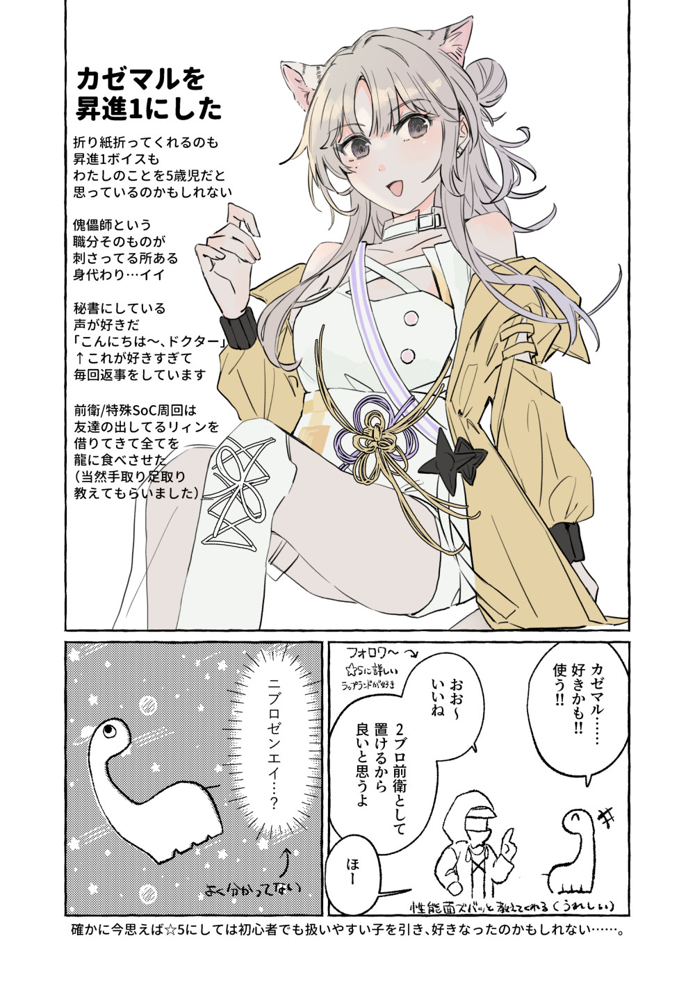 カゼマルに出会ってしまいました。一目惚れというやつです。まあるいお口もお顔も、ふわふわの猫耳もこの通り本当に可愛いのだが、ビジュアルだけでなく声も大変愛らしい。ホームに設定したり編成に組み込んだりした時のボイスはころころとして人懐っこい雰囲気なのだが、戦闘ボイスとなると喋り方が一変、別人のような一面を見せてくれるのである。